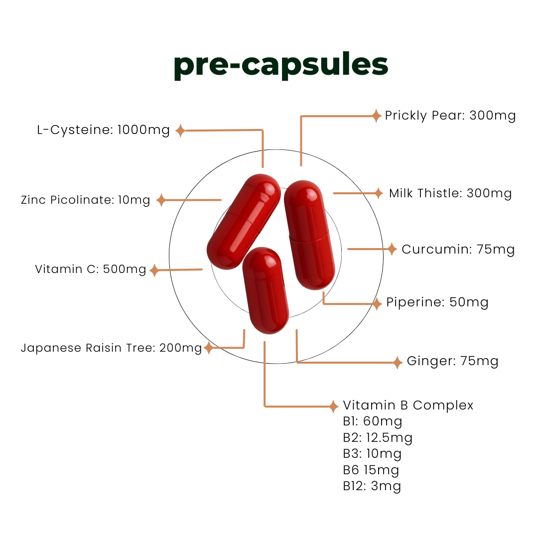 Pre-capsules: L-Cysteine, hovenia dulcis extract, prickly pear extract, milk sthistle, zinc picolinate, piperine, curcumin, ginger root extract, vitamin B (1, 2, 3, 6 & 12) and vitamin C.
